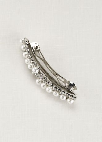 A classic barrette hair clip adorned with ivory pearls and brilliant rhinestones. A beautiful accent for that special day!