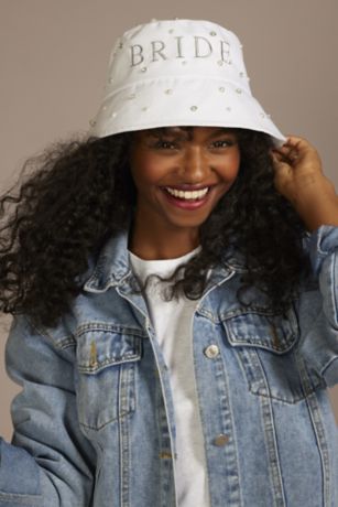 Define cool bridal style while wearing this bucket hat embellished with pearls and rhinestones. The silver embroidered "bride" helps your status stand out.