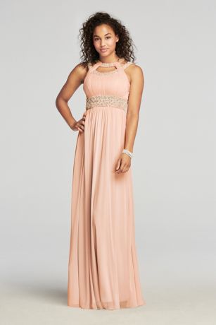 - Halter bodice features beautiful crystal and pearl beading, with cut out detail at the neckline and back for a chic Prom look.