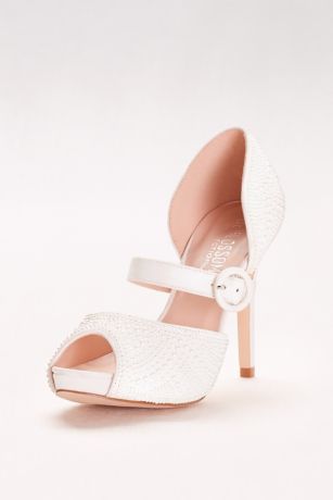 Wear pearls on your wedding day in a completely modern way: These platform Mary Jane heels are covered in the luminous gems from peep-toe to high heel.