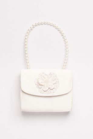 A satin purse for the sweetest little wedding party member, this structured bag is finished with a tulle-edged flower and a pearly handle.