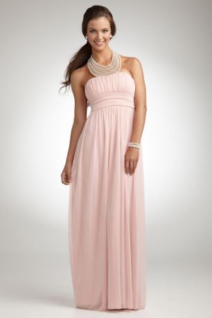 - Ruched bodice features stunning pearl and jeweled necklace halter for fashion-forward appeal.