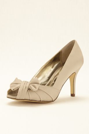 - Peep toe pump features pleated satin and bow detail.