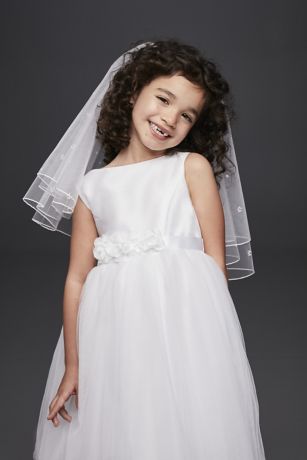 Pearl clusters form tiny flowers on this two-tier pencil-edge tulle communion veil.