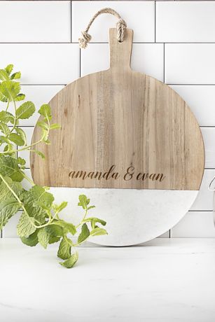 The Personalized Round Marble Acacia Serving Board is perfect for serving your guests appetizers at any gathering. The white marble and light acacia wood provide an elegant contrast on this piece of serveware. This gorgeous serving board makes a meaningful gift for newlyweds!