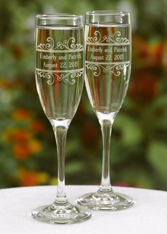 Personalized especially for the new Mr. and Mrs. these toasting flutes feature baroque design elements.