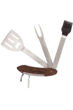 - Includes basting brush, spatula, grill fork, corkscrew, nylon pouch, and bottle opener.