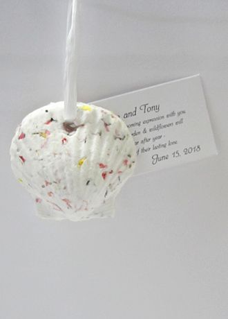 Blooming Shell Favors are personalized favors that blooms when planted! Each favor is handcrafted in the USA of 100% recycled cotton fiber, fresh flowers and perennial wildflower seeds. Your guests will enjoy it as a decoration, then may plant it in 1/4" to 1/2" soil, keep moist and watch it bloom! Each Blooming Shell Favor includes a personalized (with names and date) standard verse on a White Tag and choice of raffia color tie. Blooming Shell Favor measures 2" H x 2 1/4" W x 1/2" D. 50+ units required for personalization. Orders under 50 units will not be personalized.