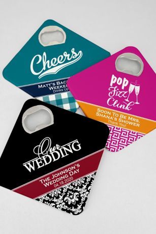 Double the function means double the FUN! Personalized Bottle Opener Coasters are a bottle opener and a coaster all in one. They are a fun, festive favor that will let your guests crack open a cold drink and have a personalized place to set it down at your special event!
