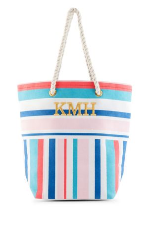 Horizontal and vertical stripes in bright blues, coral, and pastel pink on a white background take this canvas tote bag to a whole new level of trendy style. This lightweight carry-all bag makes the perfect gift for your bridesmaids. Make it extra special with personalized embroidery.