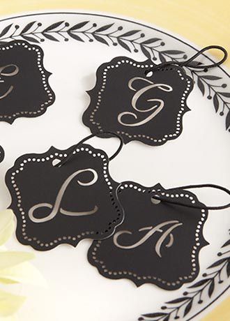 - Exquisitely designed, opaque vellum, printed monogram tag with pinhole trim and black, elastic loop string for favors and a personalized gift-wrap accent