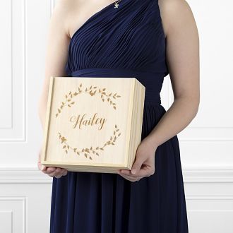 Perfect the bride-posal with this floral designed bridesmaid box. The beautifully printed wooden box is sturdy enough for future use and includes a stemless champagne flute and vegan leather card case. Ensure your ladies are ready for your big day with this customizable gift box.