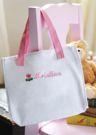 She'll be pretty in pink with our Personalized Flower Girl Tote Bag. These fashion tote bags are constructed of white canvas lined in pink cotton lining and feature sturdy pink leatherette handles. Her first name is embroidered for free on the front of the tote bag in pink thread along with a pink and green flower. As a flower girl gift the personalized tote bag is a great option for flower girls of any age. She can carry her wedding accessories to the wedding in her own personalized bag and then use the tote bag for years to come as a book bag, school bag or even a ballet bag.