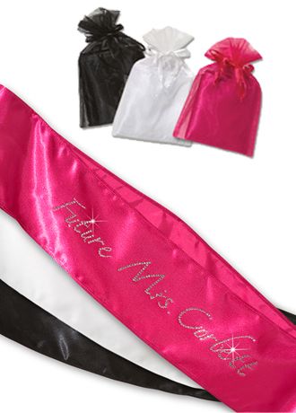 Classy personalized satin rhinestone sash with Future Mrs. and your new last name. This classy satin sash will compliment any outfit and is also perfect for rehearsal dinner! Wear your Future Mrs. Last name in style. Sash is adjustable with a safety pin so you can make it fix how you wish.