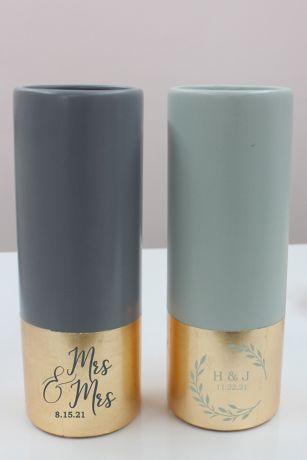 A lovely shower or wedding gift that complements any decor, this beautiful painted ceramic vase with gold metallic detailing is the perfect keepsake for the happy couple. Choose from Mr. & Mrs, Mrs. & Mrs., or Mr. & Mr.