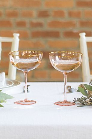 The perfect finishing touch for your wedding day, anniversary day, or every day, this set of gold-rimmed pink crystal champagne coupes may be engraved with your names for a lovely personalized twist on a classic silhouette.