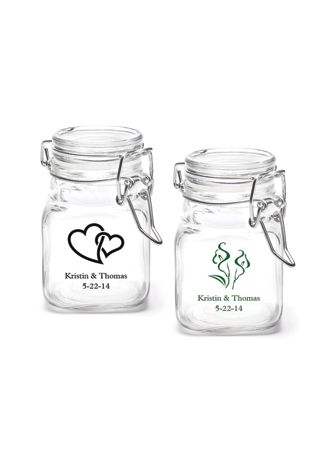 This tiny personalized apothecary jar is a lovely favor holder perfect to fill with candy and anything else that needs rounding up at your reception. The little square apothecary jar is simple enough to blend into any theme, whether beach wedding (fill it with little seashells) or garden fete (fill it with auspicious herbs!). We personalize the jars with your choice of design, as well as your names and wedding date.