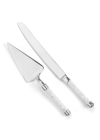 Glittering beads serving set features glass handles filled with clear glass beads. Both knife and server blades are engraved with two lines of personalization such as bride and groom's names on one line and wedding date on second line.