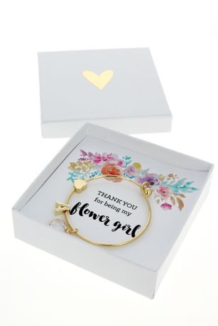 Gold Monogram Floral Flower Girl Bracelet features a monogram initial, heart charm, and a glitzy gem and comes with a cute white gift box and a floral insert just for little flower girl!