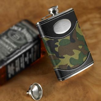 Our masculine green camouflage flask is a great addition to our line of fashionable flasks. Perfect for the lover of all things military, this handsome personalized flask stores your favorite alcoholic beverage or other refreshment and is easy to conceal. Trimmed with black leather and featuring the recipient's name or initials, our green camo flask also includes a funnel for easy filling and refilling. Holds 8 ounces of your favorite libation. This personalized gift accommodates one line of up to 15 characters including spaces .