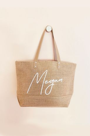 Whether you're bachelorette or honeymoon bound, this jute canvas tote bag with leather straps is a great gift for your bridal party or yourself. Customizable with white printed script.