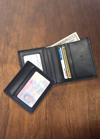 Inside there's plenty of room for currency. Genuine Leather wallet with front ID window, interior ID window, 4 turned-edge credit card pockets, 2 additional pockets, and a 6-flip insert securely hold your credit cards, license and photos, striped moir lined currency compartment. This item may be personalized with 3 initials as shown. Initials will be debossed in the order in which they are entered.