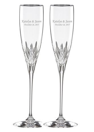 Toast to your special day with these Lenox fine crystal toasting flutes from the Firelight Platinum Signature Collection. Each flute is accented with a precious platinum rim and a deeply cut bowl to bring elegance to every occasion they are a part of. Personalizing these flutes will add a custom touch to your reception and easily transform them in to treasured wedding keepsakes. Choose from a variety of different font options and we will deeply sand blast each flute by hand.