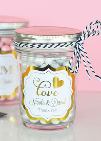 Searching for the perfect accessory for your upcoming wedding? These Metallic Gold & Silver Foil Wedding Personalized Mini Mason Jars are just that timeless touch! These sparkling jars are perfect party favors that you can fill with your favorite spices, loose-leaf tea, chocolates, candy, or nuts! Your guests can then refill them with treats as many times as their hearts' desire and remember this special day with every yummy bite!