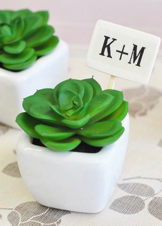 Bring a little life to your tables with our adorable Mini Potted Succulents. These precious little gardens bring a relaxing touch of the outdoors to every table without interfering with your party decor. Each white ceramic pot holds a miniature faux succulent. Further enhance the rustic look by adding on a mini wooden stake and clear label personalized with your initials (you can always just handwrite your guests name directly on the wooden stake and use them as place card holders as well!)