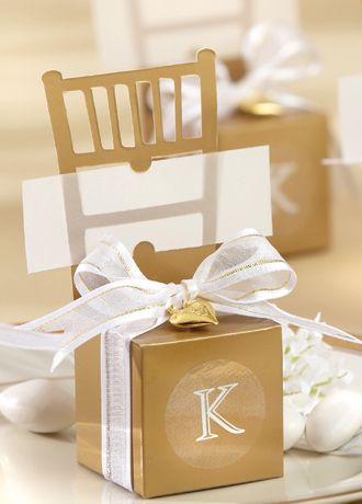 Shining moments like your wedding deserve the warm, elegant ambience that only gold can give! These classically designed, miniature chairs with a stunning, gold finish silently beckon your guests to their seats with a stylish place card and a sweet surprise! Chair decor includes a dazzling white-and-gold organza ribbon and a delicate, gold heart charm. Each favor box can be filled to hold your favorite gourmet candy, chocolates, mints or other treat!