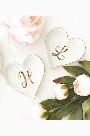 Heart shaped ring dishes with a pretty script monogram initial make stylish and practical gifts for your bosses, friends, bridal party and more! Each white dish has a metallic gold trim and is personalized with a monogram of your choice in metallic gold vinyl.