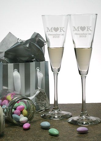 Enjoy your first toast as husband and wife with these beautiful trumpet-shaped toasting flutes on long elegant stems. Once personalized each 8 ounce flute will easily become one of your most treasured wedding keepsakes. Choose from a variety of monogram font options and we will deeply sand blast it on to each flute by hand.