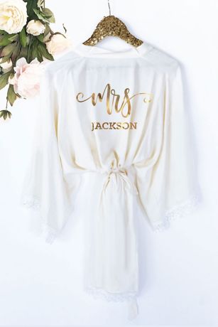 Mrs. cotton lace robes are an ideal gift for the bride to be! These delicate robes come in your choice of white, coral blush, mint, or black, and Mrs. with the name of your choice in all caps and gold foil on the back. Each robe comes with a matching belt for the outside and a delicate lace trim.