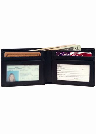 ID Flat Top Grain Nappa Leather fold wallet is perfect for those who prefer the trim look, this wallet features six credit card pockets, two additional pockets and two leather and striped moir lined currency compartments. This item may be personalized with 3 initials as shown. Initials will be debossed in the order in which they are entered. Dimension: 3 1/2" x 4 1/2" x 1/2"