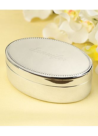 Embossed dotted border adds modern style to this personalized oval-shaped jewelry box. Add your bridesmaid's name for that truly memorable memento. The inside of the box has a velvet lining to protect your delicate jewelry. Silver-plated box measures 4 1/2" x 3" x 1 1/2". Personalization: 12 characters, including spaces and in your choice of font.