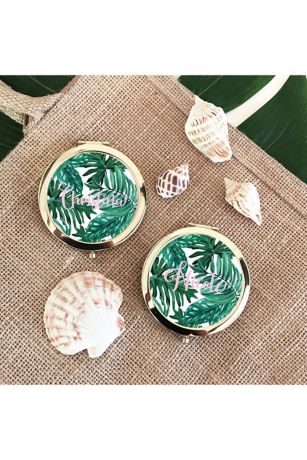 Personalized palm leaf compacts make a fun and stylish gift for your bridal party, friends, coworkers, and more! Each compact mirror is personalized with a custom name in a pretty pink script font on a palm leaf background.