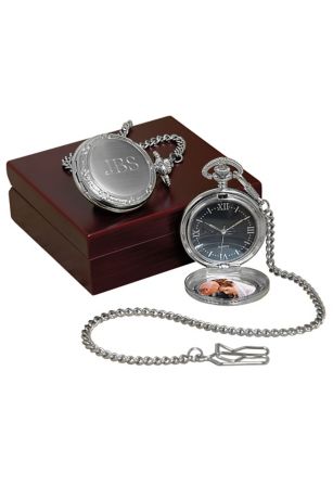 This pocket watch is a perfect gift for those gentlemen in your wedding. Embossed detail face with room for a 1 3/8" photo. This classic timepiece comes beautifully packaged in an heirloom-worthy wooden box.