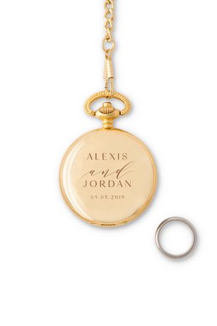 Fashioned to look like pocket watch case, this wedding ring holder is a charming alternative to a traditional pillow or box. Add your names and wedding date to personalize it.