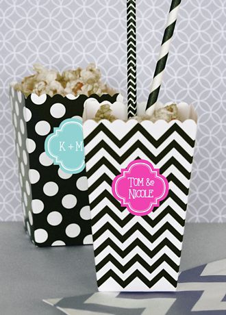 When he's "popped" the question, your bridal shower guests will be delighted to enjoy treats in these Personalized Popcorn 'n Treats Boxes. Use them on dessert tables or candy buffets to hold snacks for guests. Fill them with all kinds of treats like pretzels, candy and goodies! Colored labels are included and can be personalized to your liking!