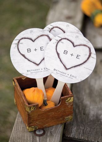 Keep guests cool with these faux birch bark favor fans. The round favor fans are printed with a birch bark look and rustic carved heart design. Printed one side only as shown.