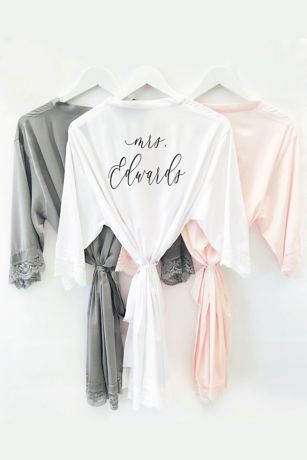 These delicate robes make a wonderful gift that brides and bridal parties will enjoy long after the big day! Everyone will love the soft, silky feel of these robes and the delicate lace trim on the sleeves and hem. These comfortable robes come in the color of your choice and are personalized with text color of your choice.