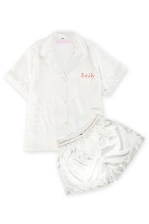 Treat yourself, the bride, or your bridesmaids to this satin sleepwear set, perfect for getting ready the morning of your wedding day. Made from luxury, lightweight satin and designed with a relaxed fit, your bridal party will be stylish and comfortable while getting ready in this beautiful pj set. Add an embroidered name or monogrammed initials to make each silky pajama top extra special.