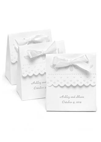 Guests will be delighted to receive this fabulous favor box filled with candies, truffles or other goodies. Favor boxes are decorated with an embossed pearl design and frilly, scalloped edge. It is recommended to use wrapped candies or liners when placing food into any type of favor box or container.