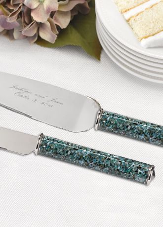 The ideal serving set for a destination or coastal wedding reception. The clear glass handles are filled with tiny aqua and black glistening seashell pieces. Add two lines of your personalization to be engraved on the knife and server as a lasting memento of your wedding day.