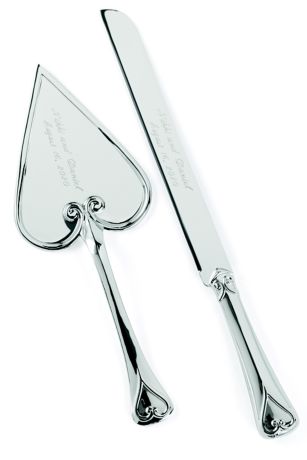 Add romance to your cake-cutting ceremony with this silver-plated serving set. The handles are accented with sculpted hearts, and the server blade is heart shaped for sweetness.