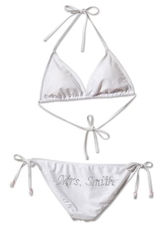 You just took the plunge, so why not take the plunge to your honeymoon, in style? This personalized rhinestone swimsuit says it all! Let everyone know you are just married and on your honeymoon and get the royal treatment you deserve. The bottoms are side tie so they easily adjust to fit on your hips just how you wish. Triangle top and bottoms are lined. Personalize with your new married last name, up to 12 characters. Note: "Mrs." is standard so no need to add in the personalization field, just your last name.