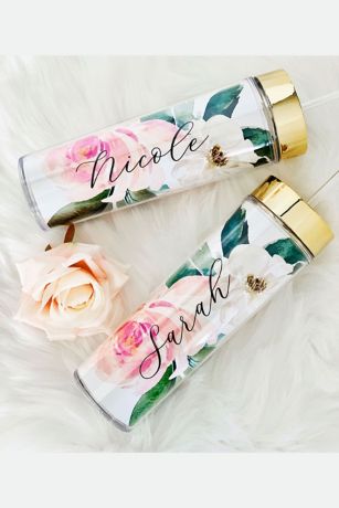 Keep your maids hydrated on the big day and beyond! Each floral acrylic tumbler comes with a gold lid, clear straw, and can be personalized with the name or word of your choice.