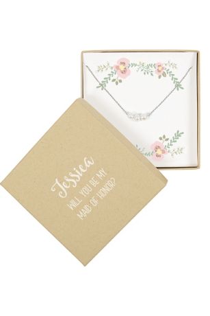 - Personalized Box Option Only (example: Jennifer, Will You Be My Bridesmaid): Choose 'Personalized Box' from the Design Selection drop down menu above. Then Enter Line 1 (example: Jennifer) up to 12 characters, including spaces. Enter Line 2 (example: will you be my) and Line 3 (example: Bridesmaid) up to 20 characters per line, including spaces.
