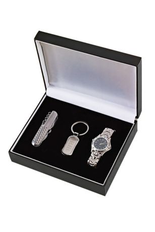 Give your groomsmen a valuable gift they'll not only cherish but be sure to use for years to come with our Personalized Three Piece Gift Set. Featuring a watch, knife and keychain, this set is the perfect way to show them how much you appreciate all they've done. The classically designed black-faced watch features a stunning silver finish and is powered by quartz movement to ensure accuracy. The well-designed pocketknife contains 13 unique tools including a sharp-edged blade, corkscrew bottle opener, scissors and more. Add the sleek silver keychain and complimentary keepsake box to this set and you're looking at the ultimate groomsmen gift.