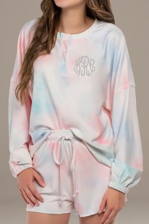 This on-trend tie-dye pajama set includes a long-sleeve shirt and comfy elastic waistband shorts that can be personalized with your initials.